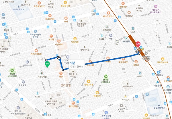 6호선 망원역까지는 660m로 걸어서 약 9분정도 걸리네요. 18년도 마포구 망원동에서 가장 싼 집으로 매매된 빌라 Top10에 6위(매매 9천만원 집, 5층, 전용 15.01㎡)와 10위(매매 1억250만원 집, 4층, 전용 24.12㎡)를 차지한 망원동 빌라입니다.